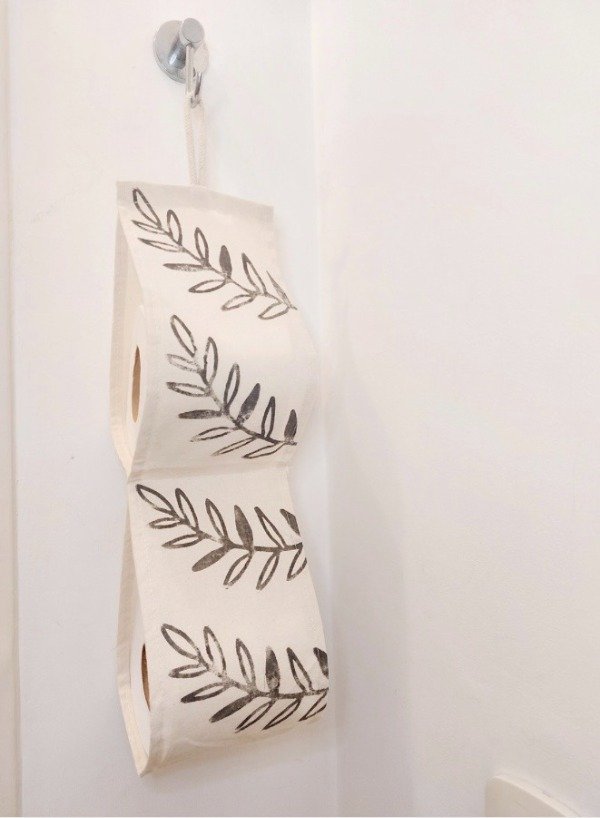 Porta rollos colgante, confeccionado en tusor liviano natural con estampa artesanal.